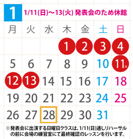 ※発表会に出演する日曜日クラスにつきましては、1/11(日)の通しリハーサル前に会場の練習室にて最終確認のレッスンを実施いたします。